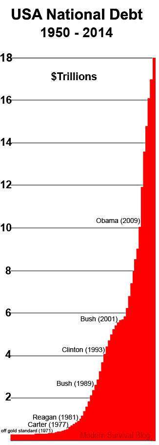 1789 George Washington $ 65 Million to 1835 Andrew Jackson $ 33,733 1789/1835 to 1860 $ 65 Million to 1861 Civil War (A. Lincoln) $ 90.5 Million Civil War (1861-1865 + reconstruction) 1865: $ 2.7 Billion to 1870 $ 2.5 Billion 1890: $ 1.5 Billion to WWI/Fed.Res./Income Tax 1913 $ 2.9; 1919 $ 27 Billion Nat. Debt: 1789 George Washington to Federal Reserve 1913: $ 2.8 B increase Woodrow Wilson Admin: (1913-1920) increased Nat. Debt from $ 2.8B to 26B 1930: $ 16 Billion to post-WWII 1946: $ 269 Billion (United Nations 1945) Nat. Debt: 1789 George Washington to United Nations 1945: $ 258 B increase Franklin D. Roosevelt Admin: increased Nat. Debt from $ 19.5 B to $ 201 Billion Vietnam 1955: $ 274 Billion to 1975, $ 533 Billion James Carter Admin: increased from $ 620 B (1977) to $ 907 Billion (1980) Washington to Carter (1789-1980; 39 Presidents) increased to $ 907 Billion |