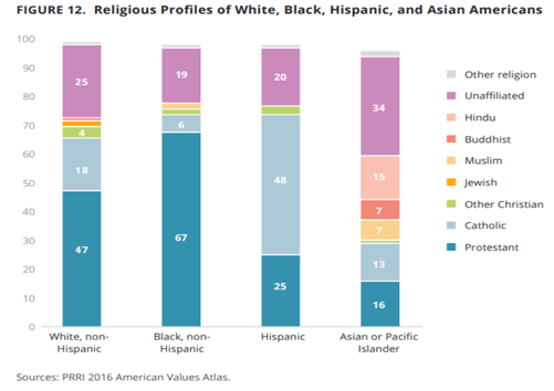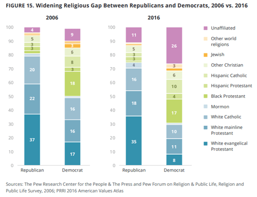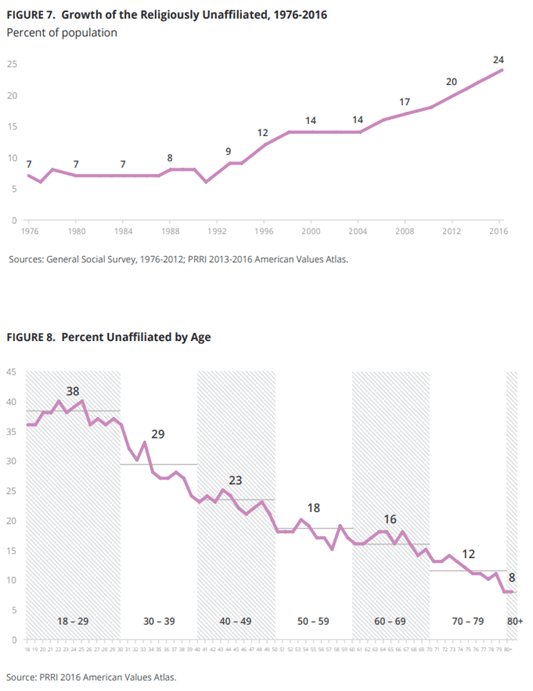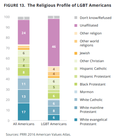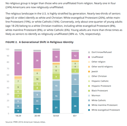 PRRI stated that “in 1976, roughly 8 in 10 (81%) of Americans identified as white Christians, and a majority (55%) were white Protestants.” But in 2016, “only 43% of Americans identified as white and Christian and only 30% as white and Protestant.” They also found that “there are 20 states in which no religious group comprises a greater share of residents than the religiously unaffiliated.” Moreover, “American’s youngest religious groups are all non-Christian.” Most of the religiously unaffiliated are “secular (58%).” Also, not much surprise, that “nearly half of LGBT Americans are religiously unaffiliated (46%).”