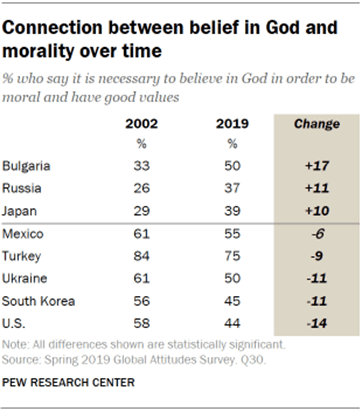 The Pew FactTank reported a year later (October 2017) that most U.S. adults now say it is not necessary to believe in God to be moral and have good valves (56%).