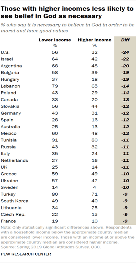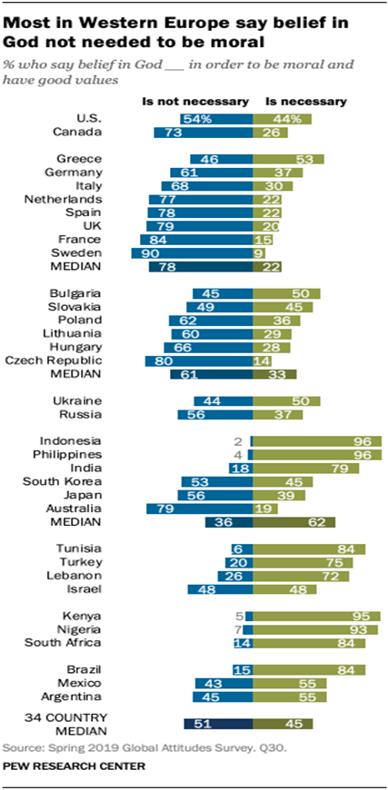 In 2019, the Pew Research Group asked over 38 thousand people in 34 countries if “it is necessary to believe in God in order to be moral and have good values.” In the United States only 44% said yes, less than the 34-country average of 45%. The once Christian Western Europe had only 22% say yes, Eastern Europe was at 33% yes. Surprisingly India was at 79% yes, and of course the Muslim nations all had very high yes responses from 75% in Turkey to 96% in Indonesia and the Philippines. Israel was at 48% showing there continued secular direction. Most African Christian nations such as Kenya (95%) and Nigeria (93%) were still very high in believe that belief in God and His commands and Scriptures lead to morally.