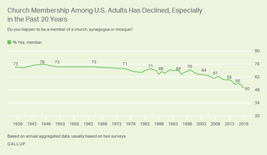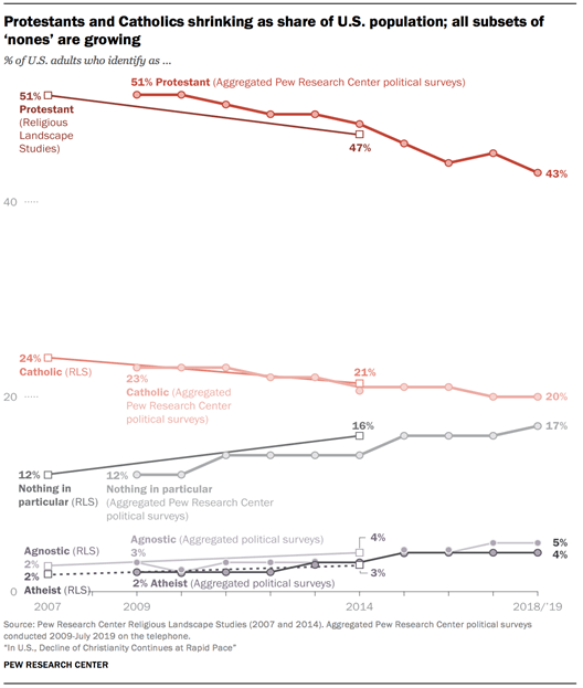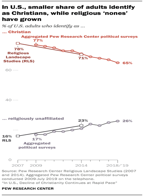 In October 2019, the Pew Research Center article “In U.S., Decline of Christianity Continues at Rapid Pace,” reported that “the religious landscape of the United States continues to change at a rapid clip… in 2018 and 2019, 65% of American adults describe themselves as Christians… down 12% over the past decade (77% – 2009). Meanwhile, the religiously unaffiliated… now stands at 26% up from 17% in 2009.”