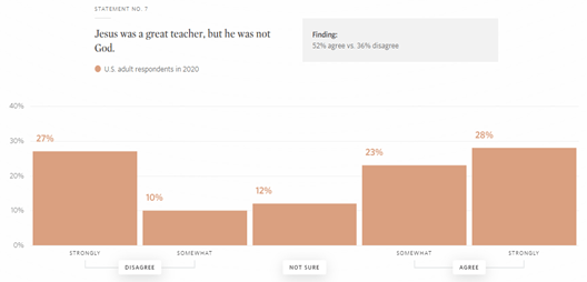 August 2020, PRNewsWire.com, reported that a LifeWay Research survey revealed that “a majority (52%) of Americans think Jesus is a great teacher yet reject His claims to be God.” That percentage would be about 64% in it included those that were “not sure.”
