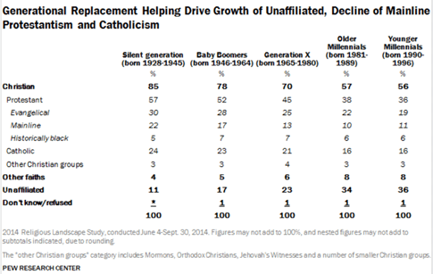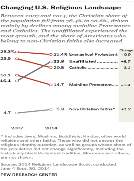 They could see that “the unaffiliated experienced the most growth” between 2007 and 2014, up 6.7% – more than six times the increase in “non-Christian faiths,” and they saw that Catholic and mainline Protestants, as well as Evangelicals were revealing their loses in membership.