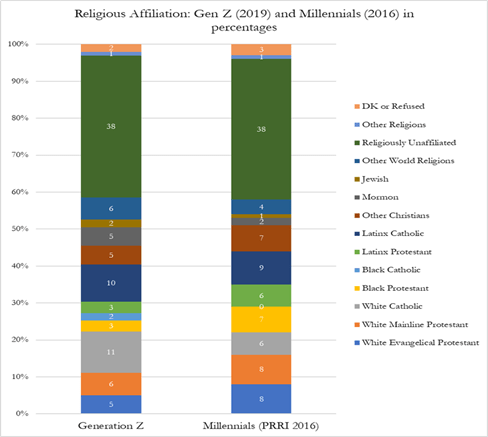 A poll (Qualtrics Panels) of 2,200+ “Gen Z Americans in late 2019” found that 38% were “religiously unaffiliated,” and 2% said “DK or Refused” to answer. This mirrored a 2016 Public Religion Research Institute (PRRI) survey which also found 38% unaffiliated and 3% saying Don’t Know or Refusing to answer.